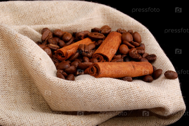 Коричневые жареные зерна кофе и палочки корицы в холщовом мешке на черном фоне