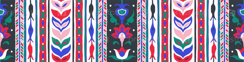 Геометрический дамасский орнамент. Икат границы. Этническая вышивка с листьями и монограммами. Племенная векторная текстура. Бесшовный народный узор в ацтекском стиле. Индийский, скандинавский, цыганский, мексиканский, африканский ковер