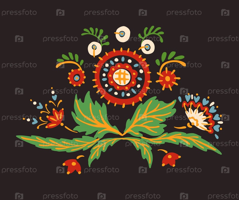 Набор этнических элементов. Бордюр представляет собой полосу с цветами, листьями, ветками, вензелями. Народная вышивка. Славянский, украинский, русский мотив. Хохлома, матрешка, дымковская игрушка. Мексиканский, индийский, цыганский ковер. Вязаное кружево