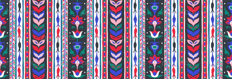 Геометрический дамасский орнамент. Икат границы. Этническая вышивка с листьями и монограммами. Племенная векторная текстура. Бесшовный народный узор в ацтекском стиле. Индийский, скандинавский, цыганский, мексиканский, африканский ковер