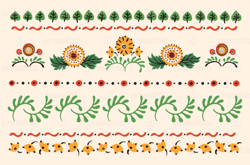 Набор этнических элементов. Бордюр представляет собой полосу с цветами, листьями, ветками, вензелями. Народная вышивка. Славянский, украинский, русский мотив. Хохлома, матрешка, дымковская игрушка. Мексиканский, индийский, цыганский ковер. Вязаное кружево