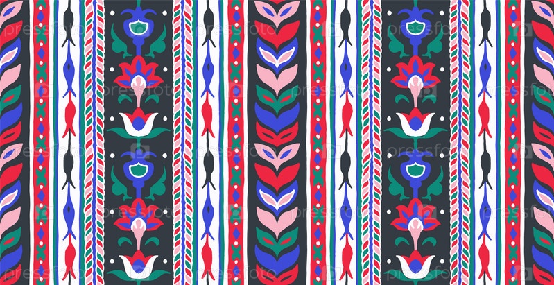 Геометрический дамасский орнамент. Икат границы. Этническая вышивка с листьями и монограммами. Племенная векторная текстура. Бесшовный народный узор в ацтекском стиле. Индийский, скандинавский, цыганский, мексиканский, африканский ковер