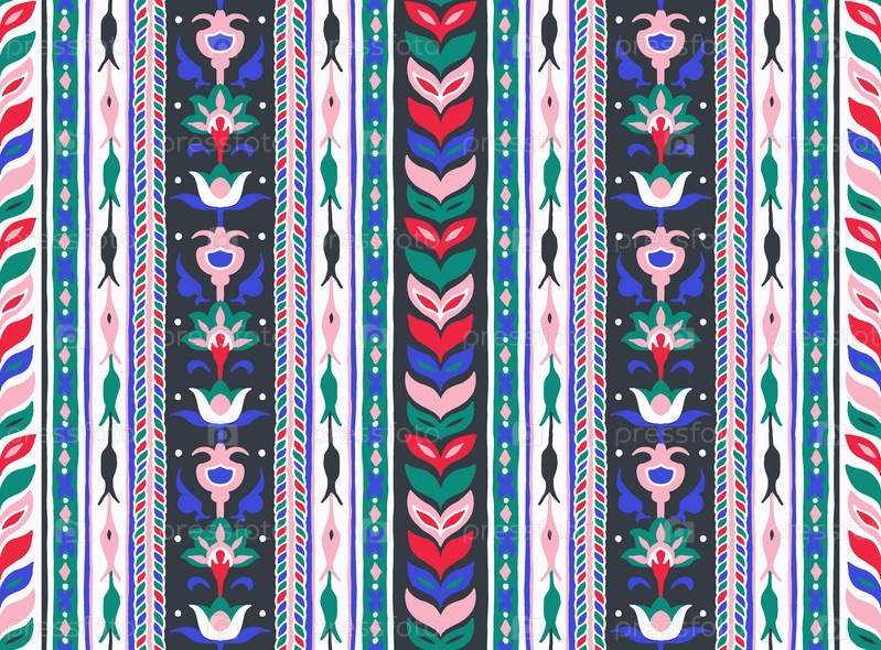 Геометрический дамасский орнамент. Икат границы. Этническая вышивка с листьями и монограммами. Племенная векторная текстура. Бесшовный народный узор в ацтекском стиле. Индийский, скандинавский, цыганский, мексиканский, африканский ковер