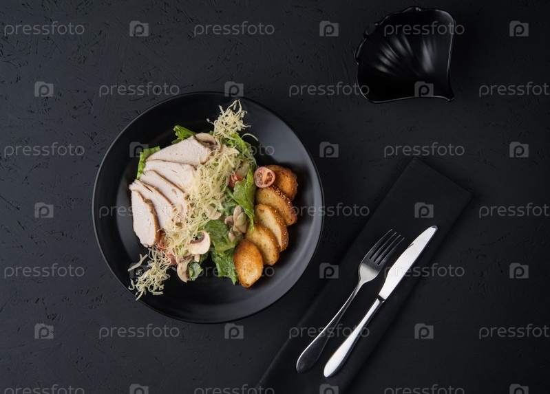 Мясное блюдо на черной поверхности