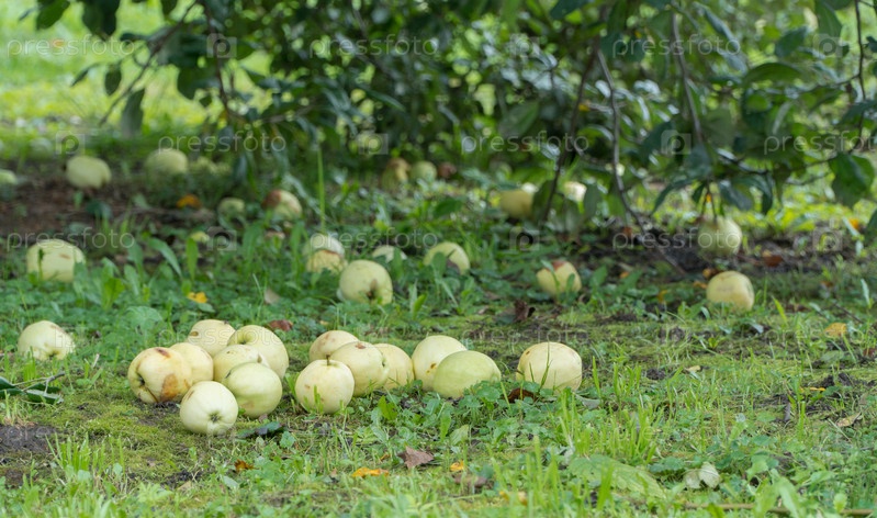 Яблоки на земле в саду