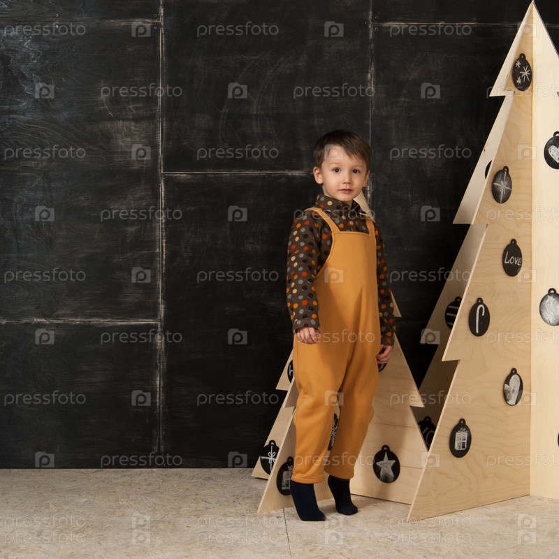 Маленький мальчик рядом с декоративными елками