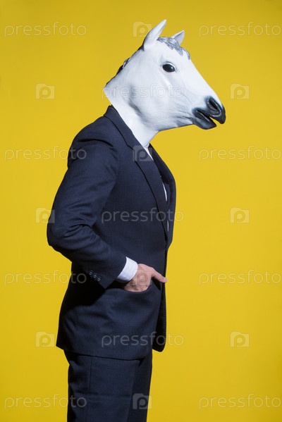 Мужчина в маске лошади на желтом фоне