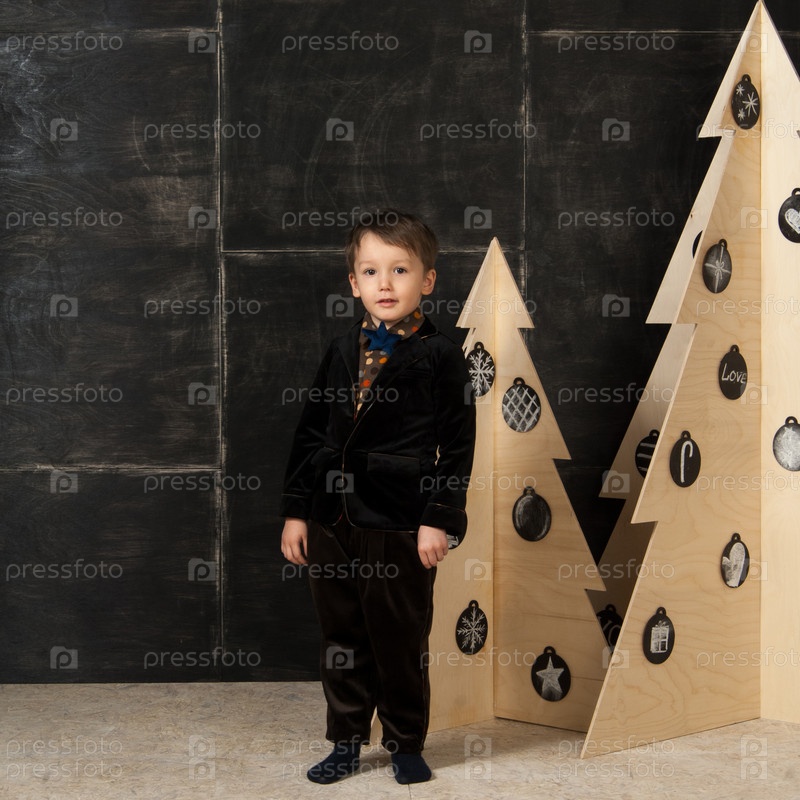 Маленький мальчик рядом с декоративными елками