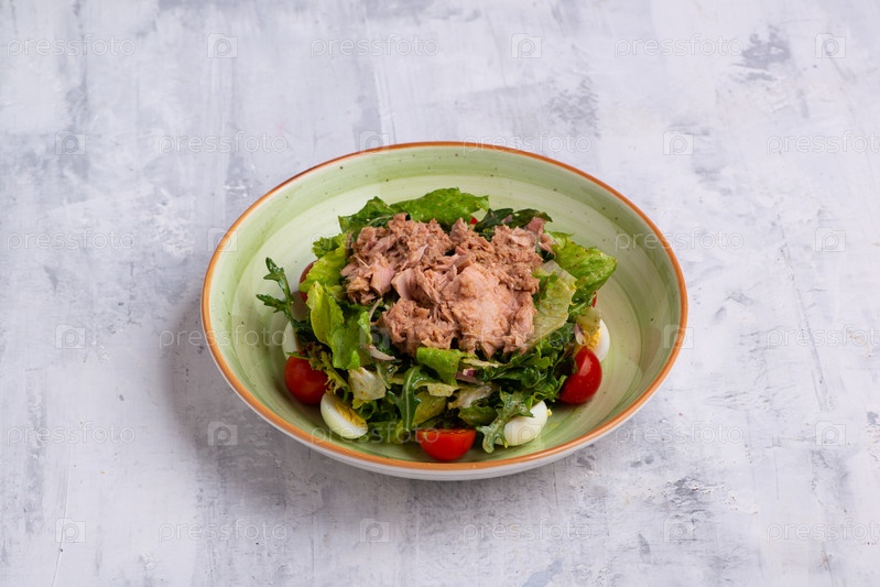 Крупный план салата из тунца в миске на белом деревянном фоне