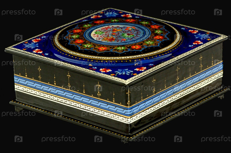 Крупный план шкатулки с художественной росписью на черном фоне. Средняя Азия, Узбекистан