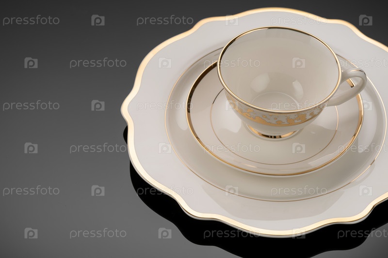 Роскошная посуда на черной отражающей поверхности