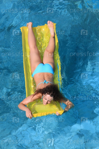 Красивая сексуальная женщина лежит на воде на надувном матрасе в бассейне