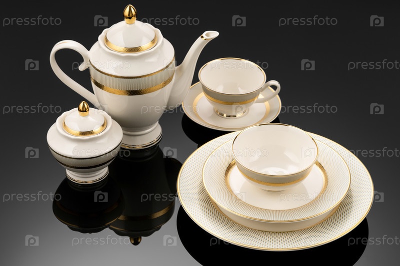 Роскошная посуда на черной отражающей поверхности