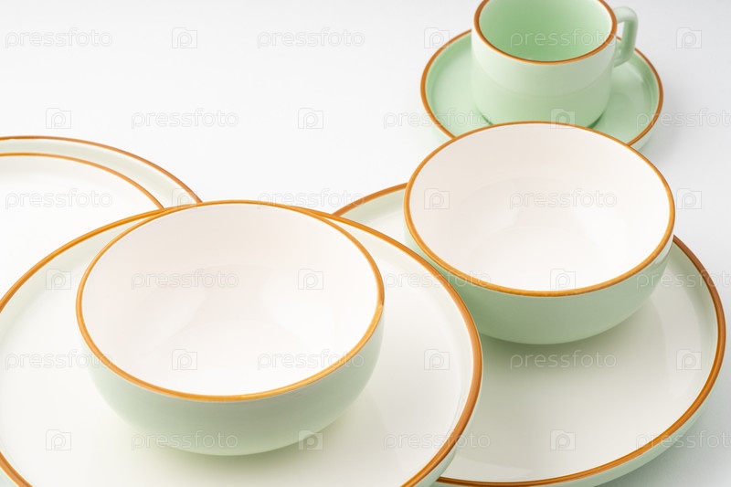 Набор керамической посуды на белом фоне