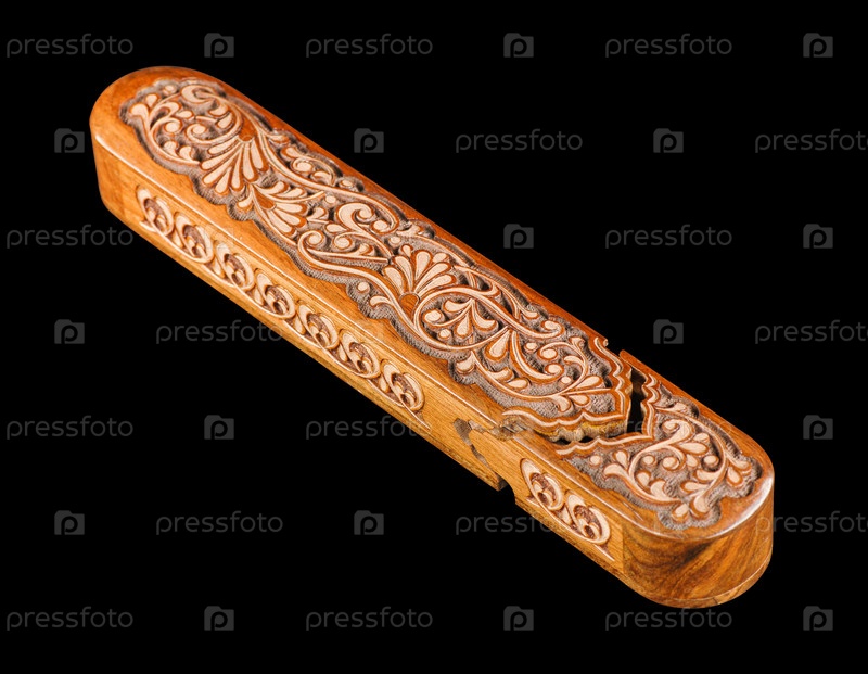 Художественная резьба по дереву на пенале на черном фоне. Средняя Азия, Узбекистан