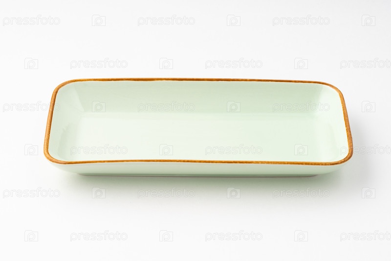 Одна керамическая зеленая прямоугольная тарелка на белом фоне