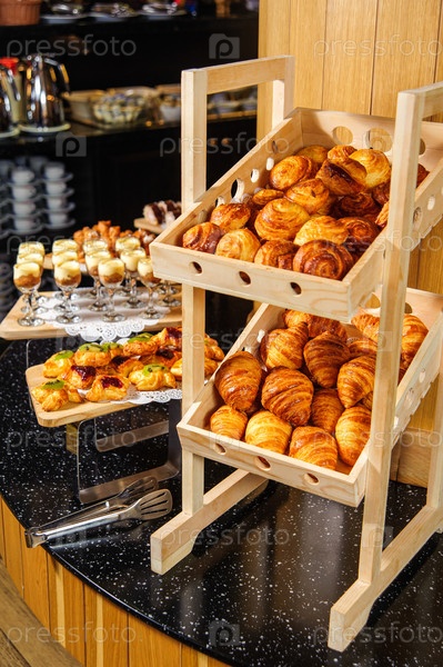 Вертикальный снимок фуршета с деревянными корзинами, полными круассанов, для выставки продуктов