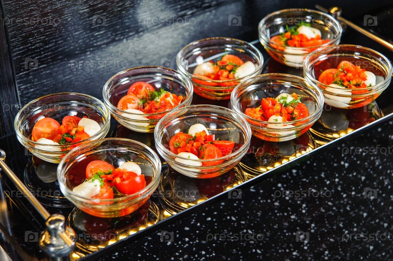 Крупный план набора томатных салатов в маленьких мисках на подносе