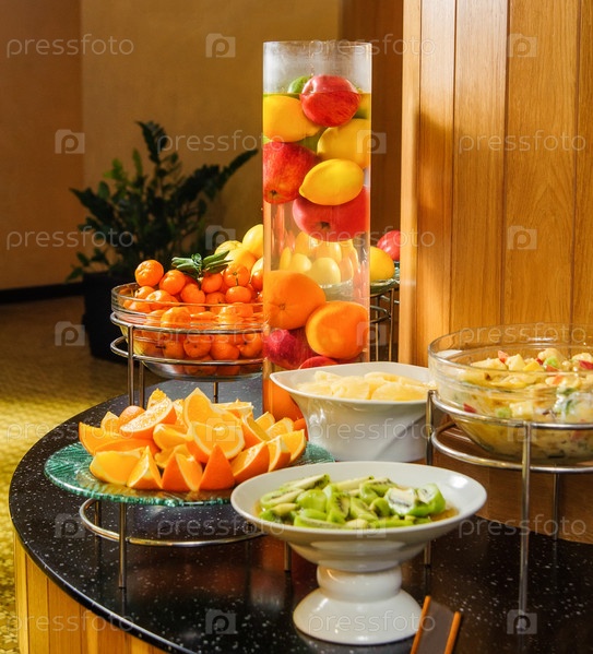 Вертикальный снимок фуршета с тарелками с фруктами для выставки продукции
