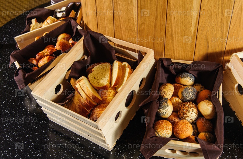 Шведский стол с разнообразным хлебом в деревянных корзинах