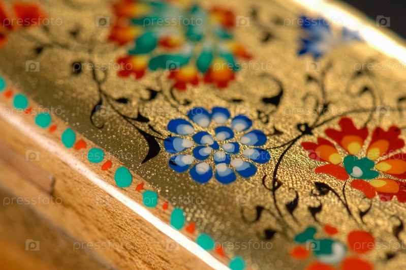 Крупный план красочной художественной росписи на коробке. Средняя Азия, Узбекистан