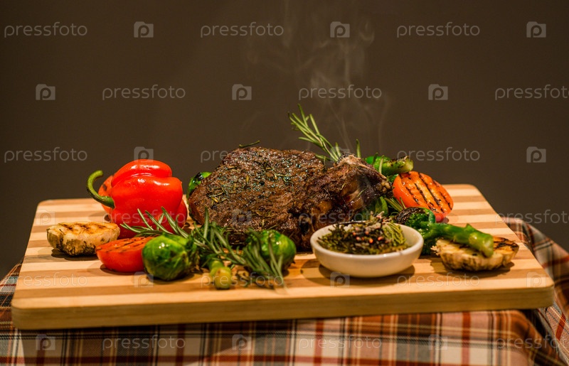 Крупный план сервировочного стола на обед, жареное мясо, овощи, зеленый перец и картофель на гриле на деревянной доске