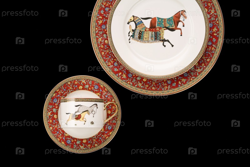 Вид сверху крупным планом на роскошную керамическую посуду, изолированную на черном фоне