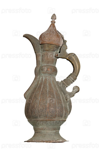 Старинный медный кувшин с художественной чеканкой и гравировкой на белом фоне