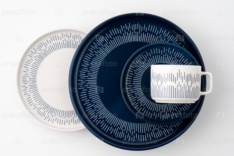 Набор сине-белой роскошной керамической кухонной утвари на белом фоне