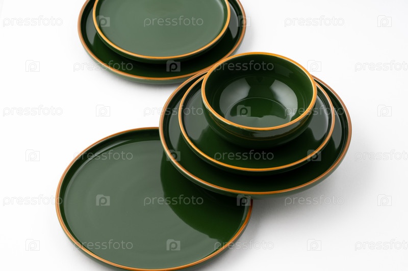 Набор зеленых керамических тарелок и чаша на белом фоне