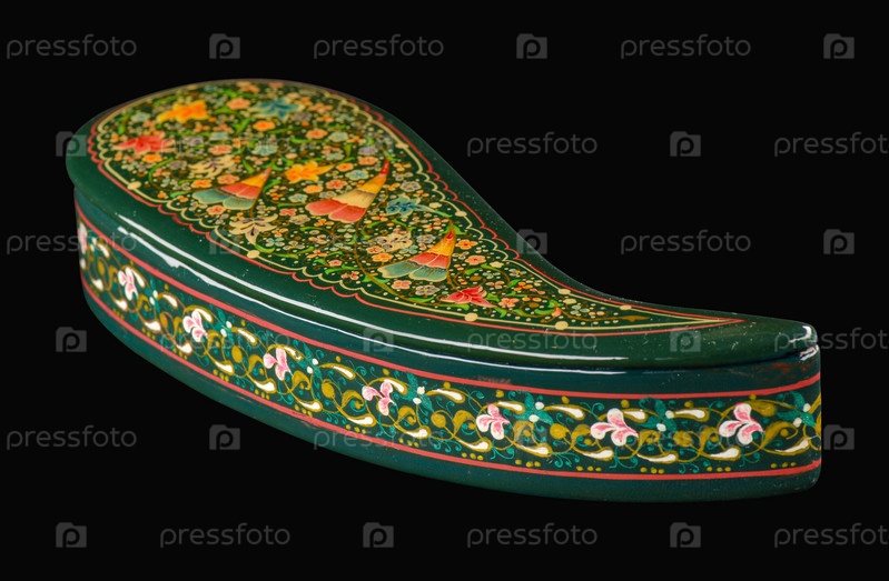 Крупный план шкатулки с художественной росписью на черном фоне. Средняя Азия, Узбекистан