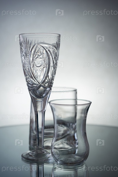 Вертикальный снимок пустых стаканов для разных напитков на сером фоне