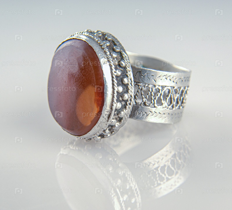 Винтажное серебряное кольцо с драгоценным большим камнем, изолированным на отражающем фоне