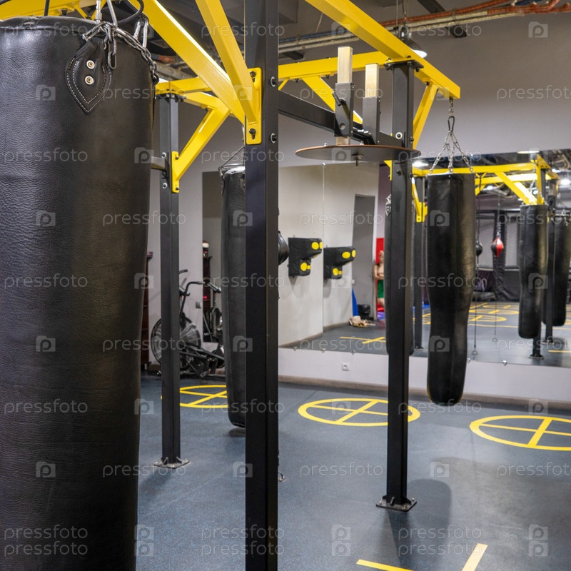 Вертикальный снимок боксерских мешков в спортивном комплексе