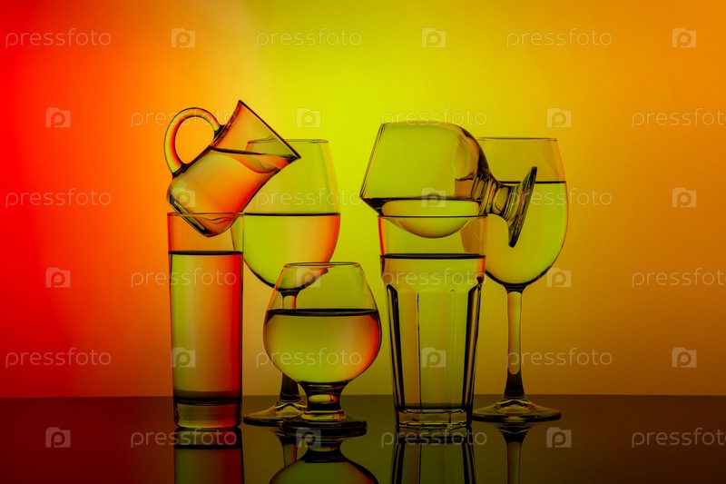 Несколько стаканов для разных напитков сложены на красочном фоне