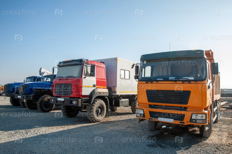 Ряд больших самосвалов и машин на строительной площадке