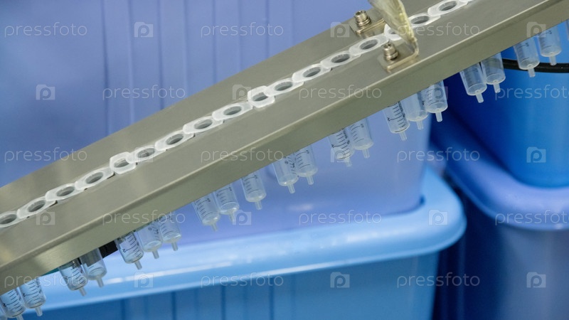 Упаковка прозрачных медицинских шприцев, расположенных в ряд в металлическом контейнере