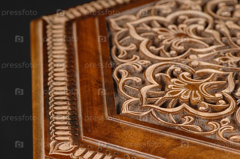 Винтажный восточный деревянный стол крупным планом с художественной резьбой на черном фоне, Узбекистан