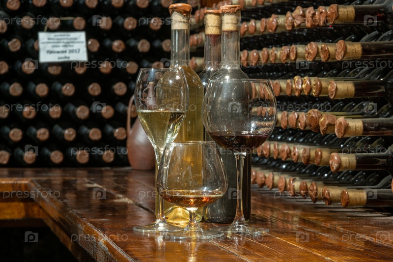 Крупный план бутылок разных видов вина на фоне винного погреба. Дегустация вин