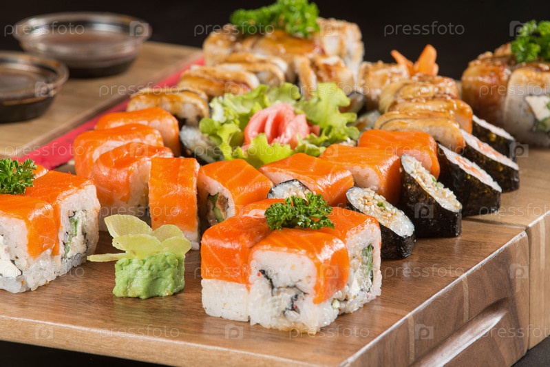 Крупный план суши на деревянной тарелке