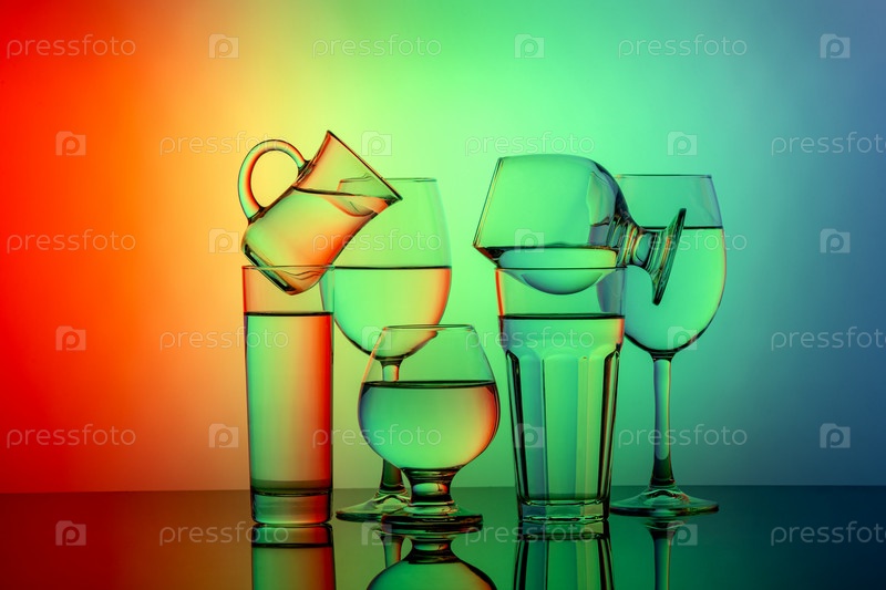 Несколько стаканов для разных напитков сложены на красочном фоне