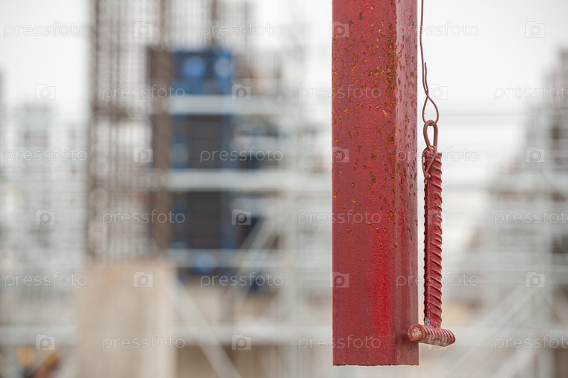 Избирательный фокус подвесного рельса с молотком для звонка в обеденный перерыв или в конце рабочего дня на стройке с размытым фоном