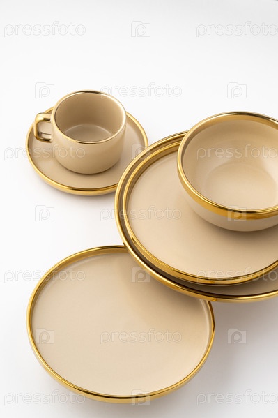 Набор светло-коричневой керамической тарелки и чашки на белом фоне