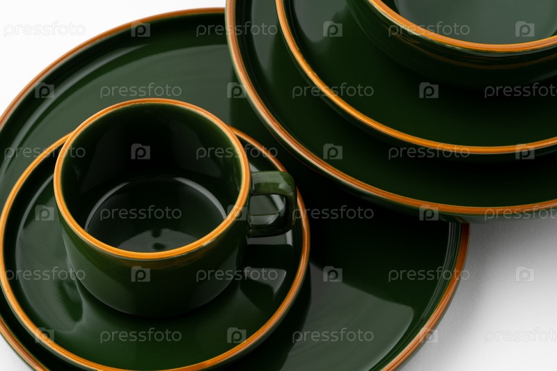 Набор темно-зеленой керамической посуды с оранжевыми очертаниями