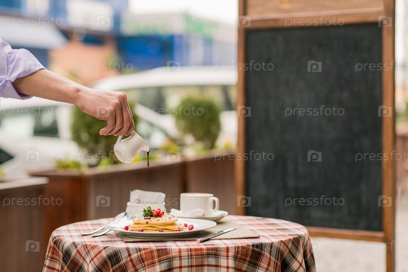 Повар поливает сиропом блины с ягодами на сервировочном столе на завтрак