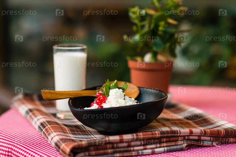 Крупный план сервировочного стола на завтрак, творог с ягодами и стакан молока