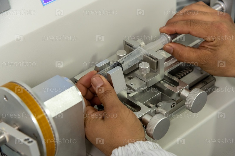 Крупный план рук, работающих на машине на складе медицинского производства шприцев