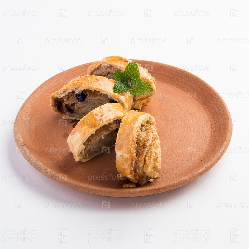 Красивый снимок вкусных сладких рулетиков с грецкими орехами, изюмом и сахаром