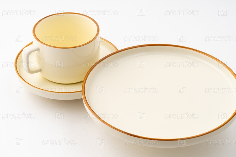 Набор белых и коричневых керамических тарелок и чашек на белом фоне