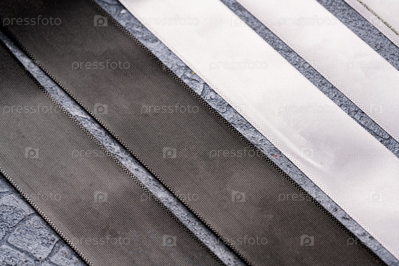 Крупный план развернутой черной ленты и белой ленты на синем столе